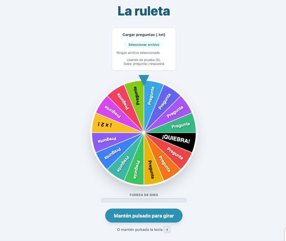 Si el otro día aprendíamos a generar roscos tipo pasapalabra para que repases un tema y compruebes tus conocimientos de forma divertida. Hoy vamos a generar una herramienta que hemos bautizado como la “ruleta ” Además te va a permitir subir y cargar la base de conocimiento en un archivo, lo. que nos va a dar mucho juego reutilizándola. Te dejo una pantalla de cómo nos va a quedar la aplicación.